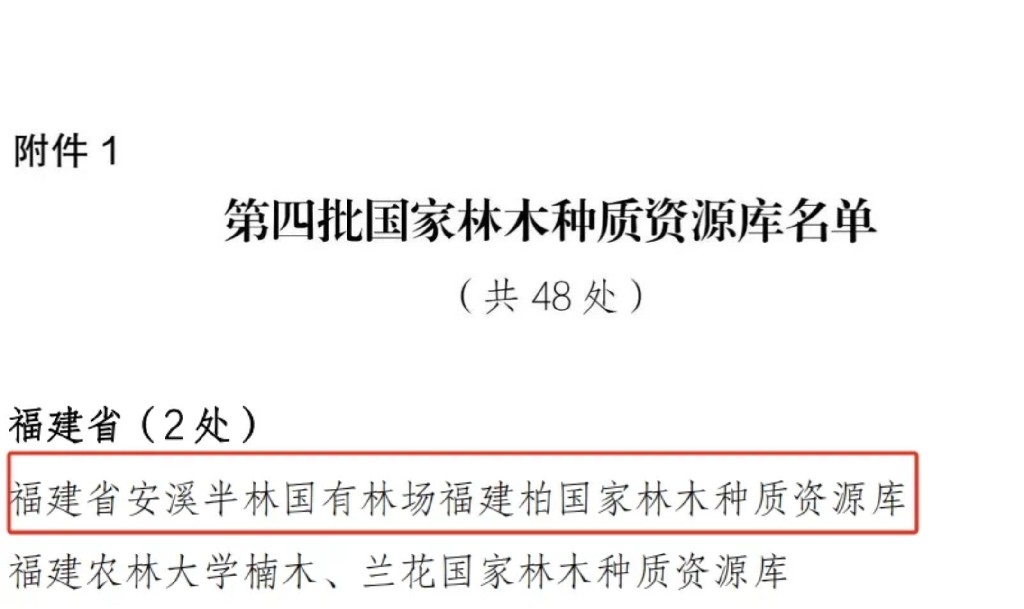 4月30日,国家林业和草原局公布第四批国家林木种质资源库名单,我市安溪半林国有林场福建柏国家林木种质资源库成功入选,成为福建省此次获批的两家林木种质资源库单位之一,标志着我市福建柏种质资源收集保存、鉴定评价、创新利用工作迈上新台阶。