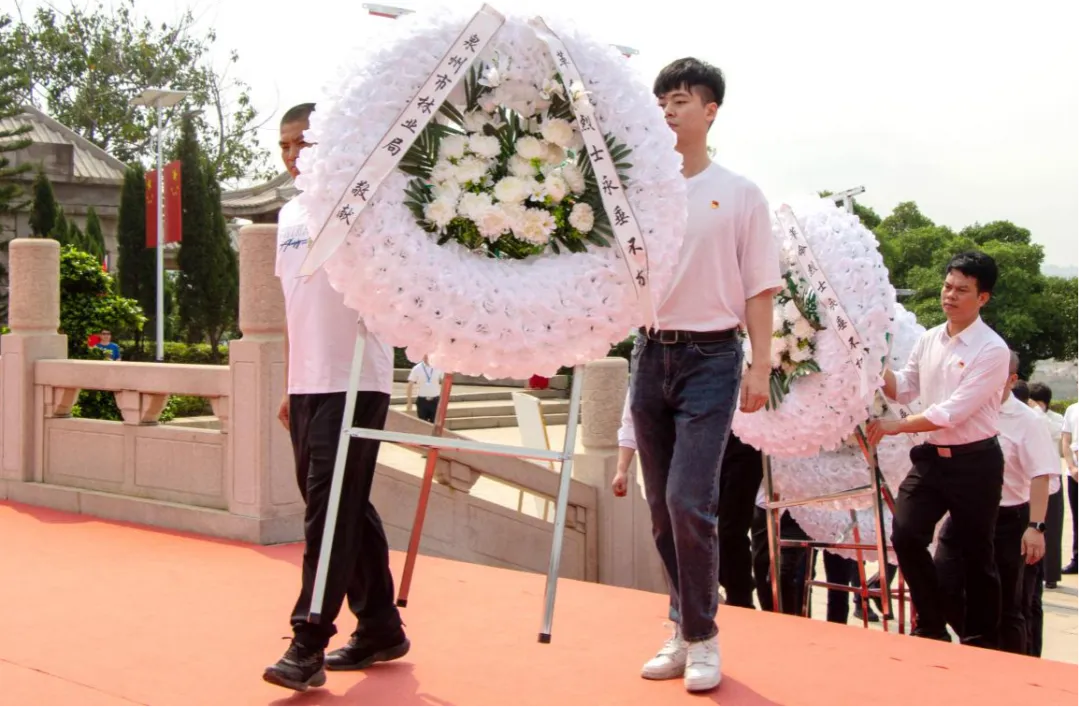 在泉州市革命烈士陵园,全体党员、干部职工整齐列队,奏唱国歌,默哀致敬,敬献花篮、鲜花,并依次走到革命烈士纪念碑前,缓步绕行一周,瞻仰烈士纪念碑,表达对革命先烈的哀思与怀念。